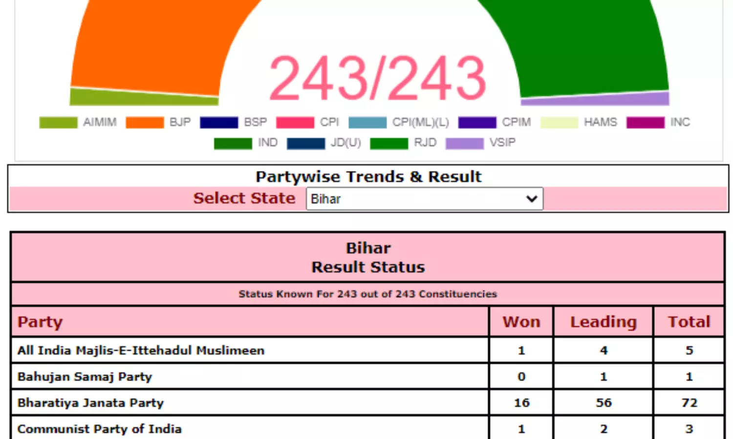 Results declared for 52 out of the total 243 seats. BJP and RJD win 16 seats each