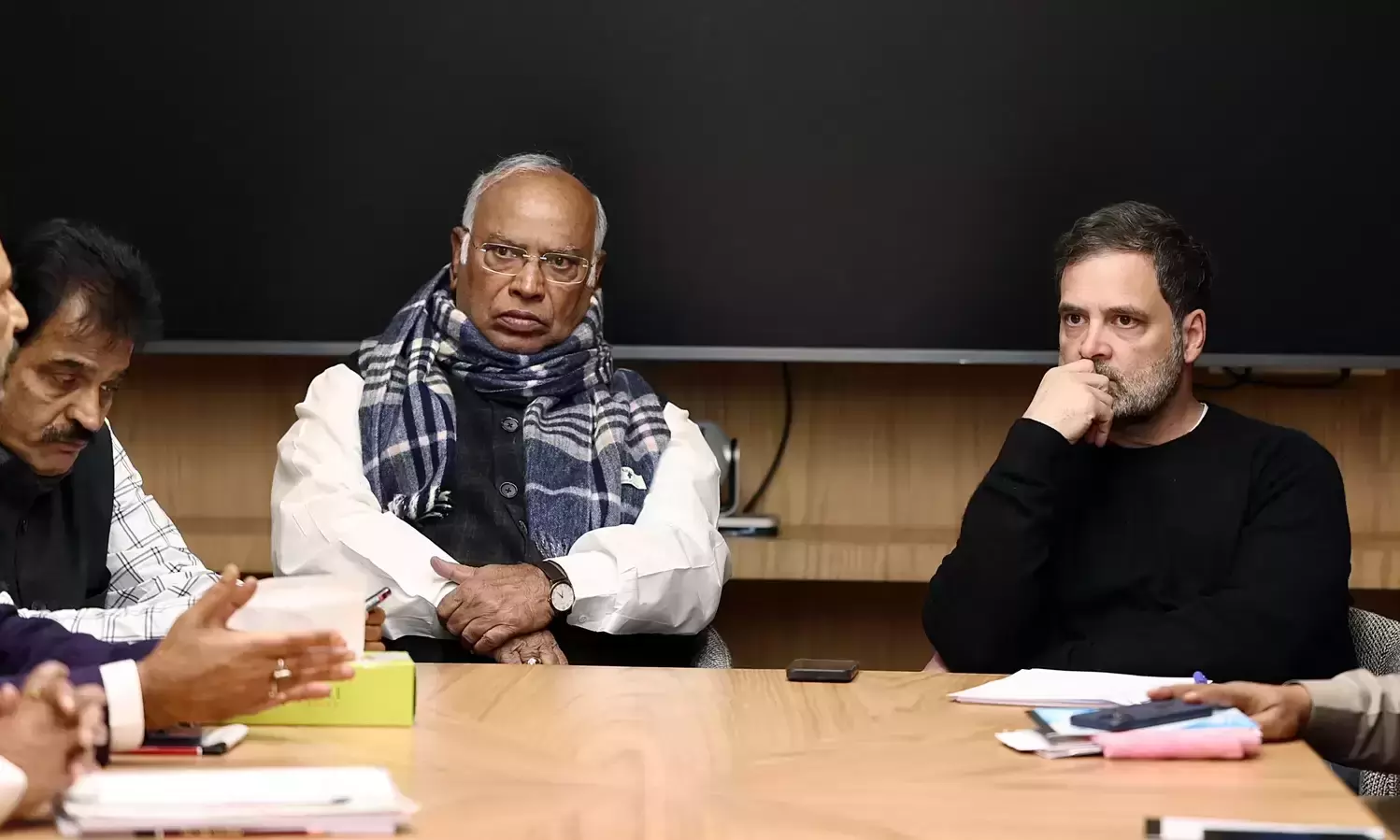 Congress chief Mallikarjun Kharge and Lok Sabha LoP Rahul Gandhi during a meeting with party leaders. (Congress-X)