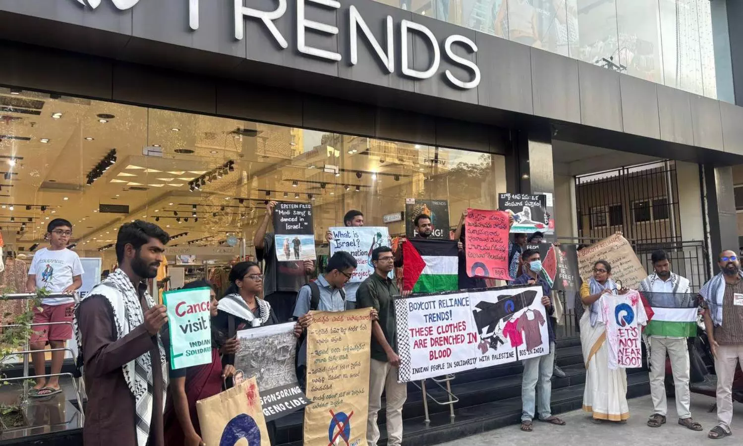 Hyderabad: Indian People in Solidarity with Palestine (IPSP) staged a demonstration outside Reliance Trends in Secunderabad Saturday, part of coordinated actions in Mumbai, Delhi, Hyderabad, Visakhapatnam, Vijayawada, and Pune targeting Mukesh Ambani's Reliance for its alleged deep ties to Israel amid the "genocide" in Palestine, backed by the US and others.
