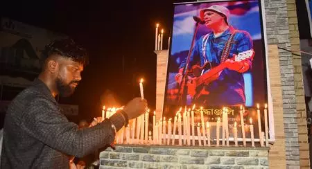 People showered petals on the ambulance, sang his songs in unison, and held aloft banners, cut-outs, and gamosas emblazoned with the words 'Zubeen Garg Forever'.