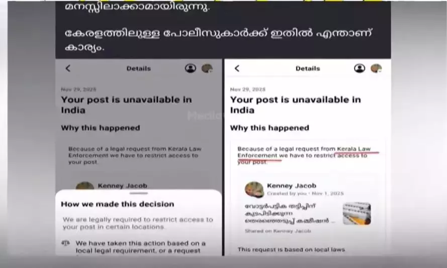 The posts of Malayali activists are being removed while posts by prominent national-level social media activists, including Dhruv Rathee, remain online. Facebook deleted a post by journalist Mukhtar Udarampoyil in which he mocked the Central Election Commission. Another post sharing and commenting on a MediaOne report about non-functional CCTV cameras in Bihar, as well as a critical post on the Election Commission from the profile of Kenny Jacob, met the same fate. A post about SIR by the user Irshad Lavender was also taken down. Notifications on all these profiles stated that the removal followed a complaint from the state police.