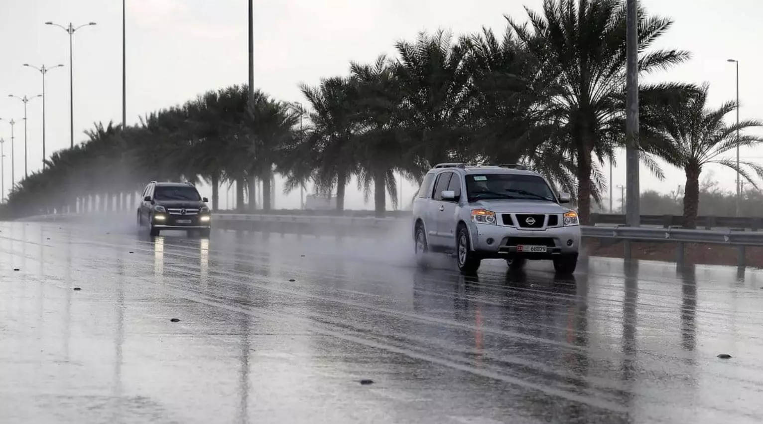 Showers were reported in several emirates. In Abu Dhabi, rain fell across residential districts and main roads, with vehicles moving through water-covered streets under overcast skies. Garden areas also saw light rainfall.