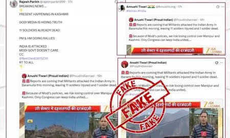 The Press Information Bureau (PIB) highlighted misleading posts from pro-Pakistani accounts claiming 11 soldiers injured and one dead. "Several pro-Pakistani accounts are circulating posts claiming that militants attacked the Indian Army in Baramulla, resulting in 11 soldiers being injured and one fatality. This claim is fake," PIB stated, sharing screenshots of false reports and TV visuals.