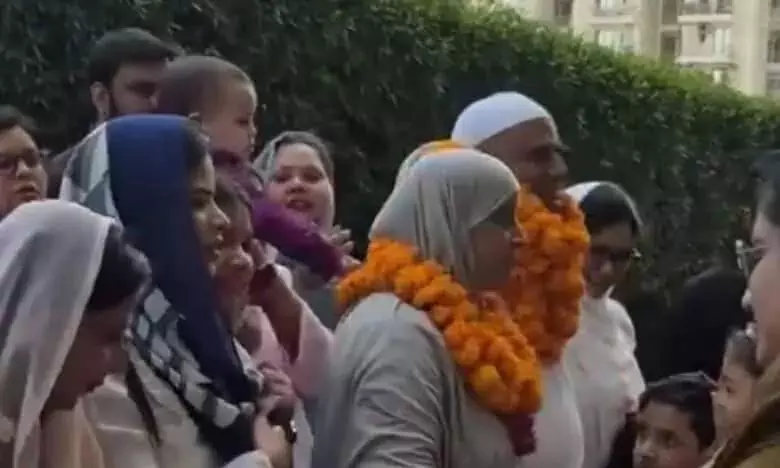 Ghaziabad: Hindus in a local colony showered an elderly Muslim couple with flower garlands, hugs, and cheers as they left for the airport to begin their Hajj pilgrimage.