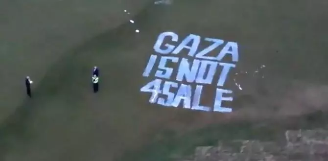 "Gaza is not for sale" was also painted on one of the course's dug-up greens and holes, Reuters reported.